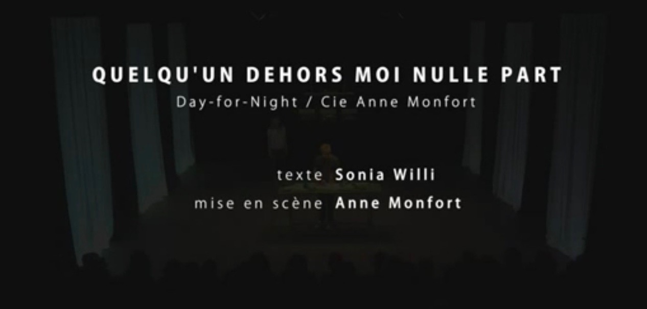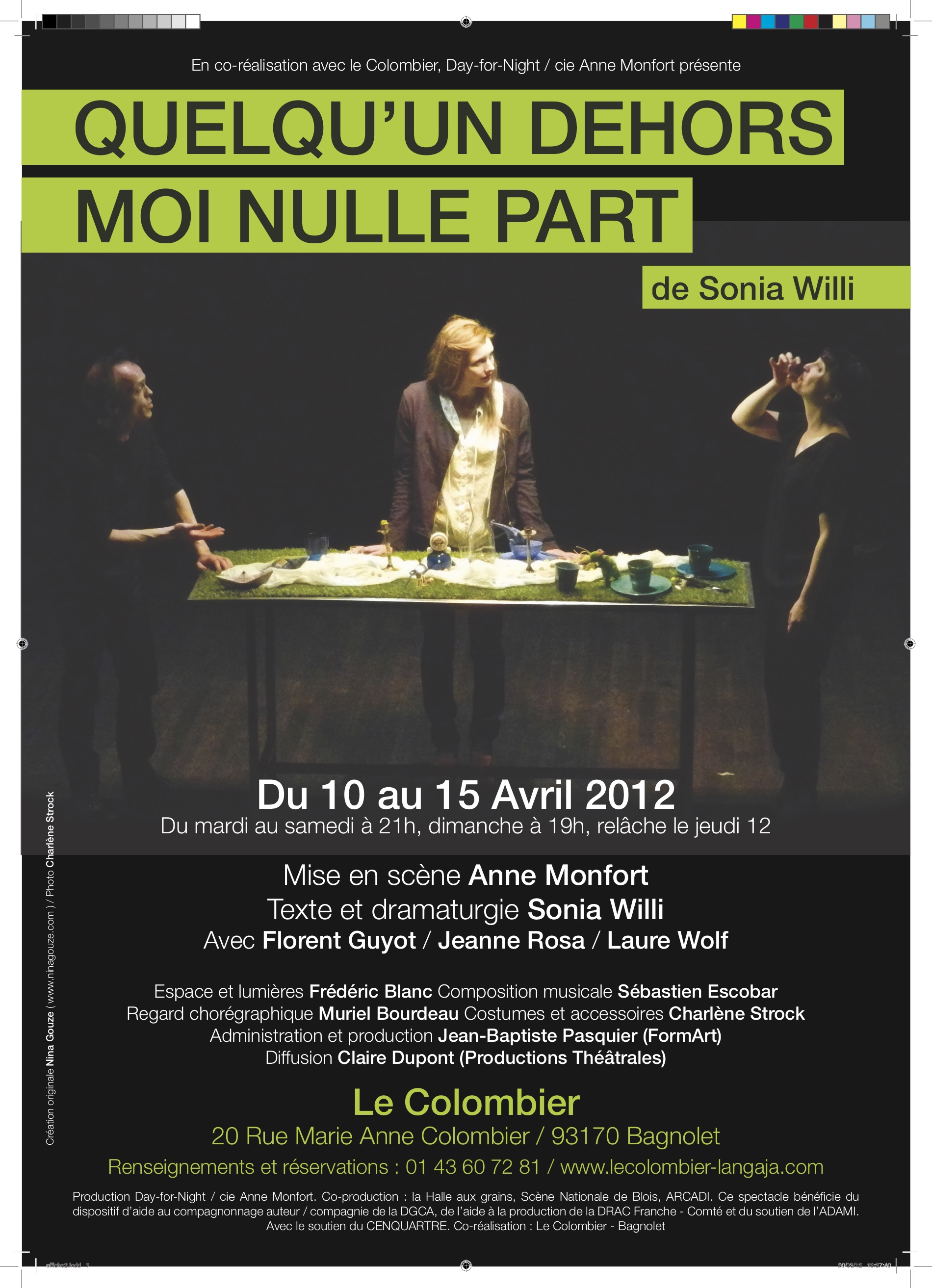 « QUELQU’UN DEHORS, MOI NULLE PART » de Sonia WILLI a été créé en résidence de création à la Halle aux Grains, Scène Nationale de Blois en mars 2012 dans une mise en scène d’Anne MONFORT (Compagnie day-for-night) puis repris au Théâtre du Colombier (Bagnolet) et à la Ferme de Bel Ebat (Guyancourt). Avec les comédiens :…